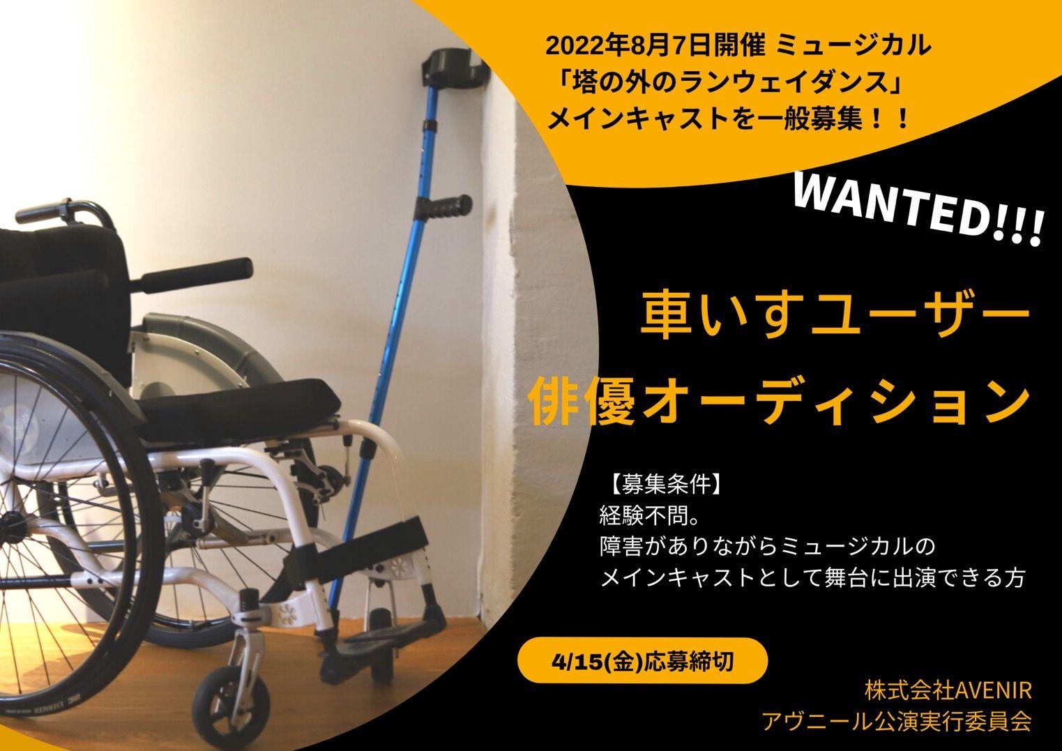 脚や腰などに、実際に障害があるなどの事情により、車いすを利用している男性で、ミュージカルに出演していただく方の募集です。
